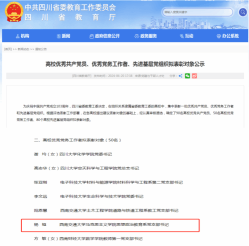 喜报|学院思想政治教育系党支部书记杨桓同志荣获四川高校优秀党务工作者荣誉称号