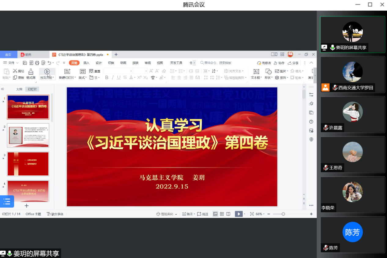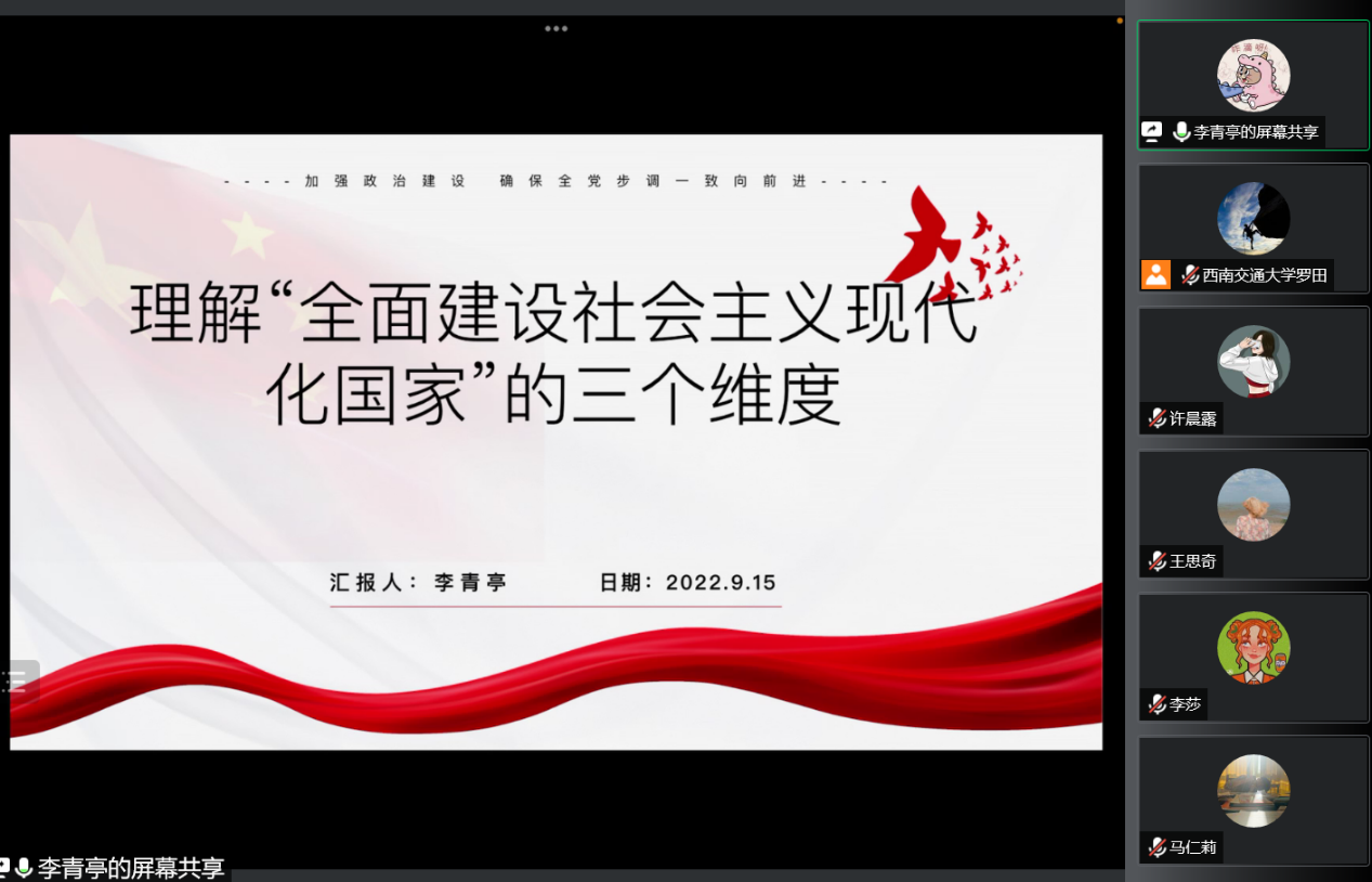 2022年9月15日下午,365英国上市网站官网2020级硕士研究生党支部召开线上组织生活会,按照既定组织生活会学习分组名单,聆听了李青亭、姜玥、陈芳三位同志关于学习习近平新时代中国特色社会主义思想的心得体会。本次会议由党支部书记罗田同志主持,支部全体党员参加。