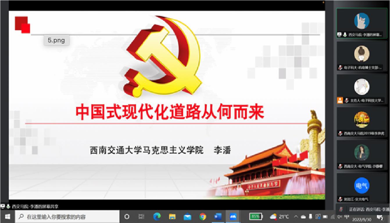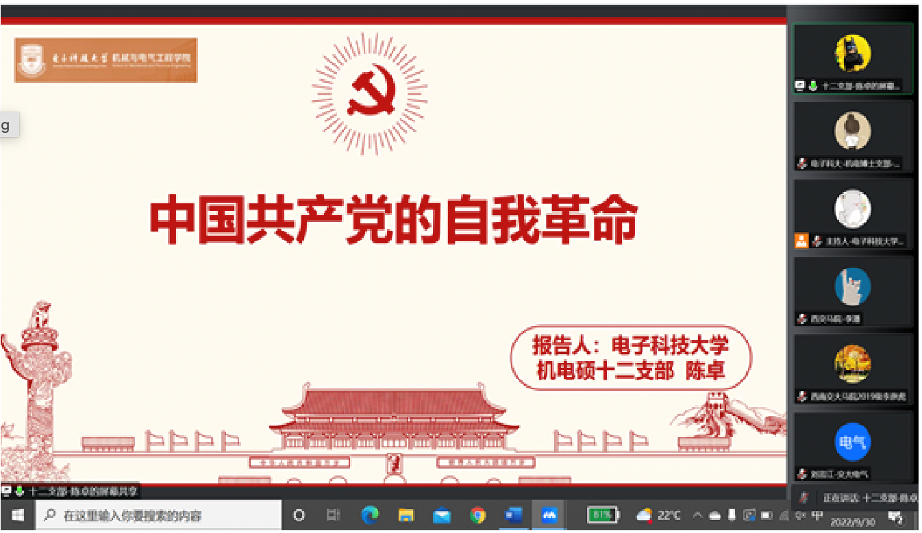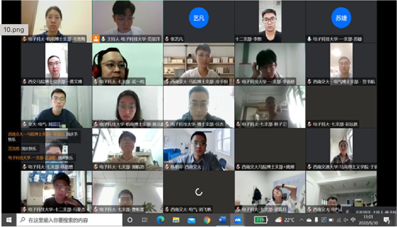 2022年9月30日,在喜迎祖国母亲73周年华诞和党的二十大召开之际,我院博士党支部同本校电气工程学院2022级博士党支部、电子科技大学机电学院博士党支部、硕士七、十二支部以及电子科技大学物理学院研究生一支部共6个支部,共计234人,在上午10时开展了线上支部联建活动,活动由电子科技大学机电学院博士党支部书记范昊洋主持。首先,范昊洋同志向与会党员简要介绍了今年9月以来的新政策,旨在带领大家快速了解时下新政,提升党员同志理论认知和政策风向感知度。