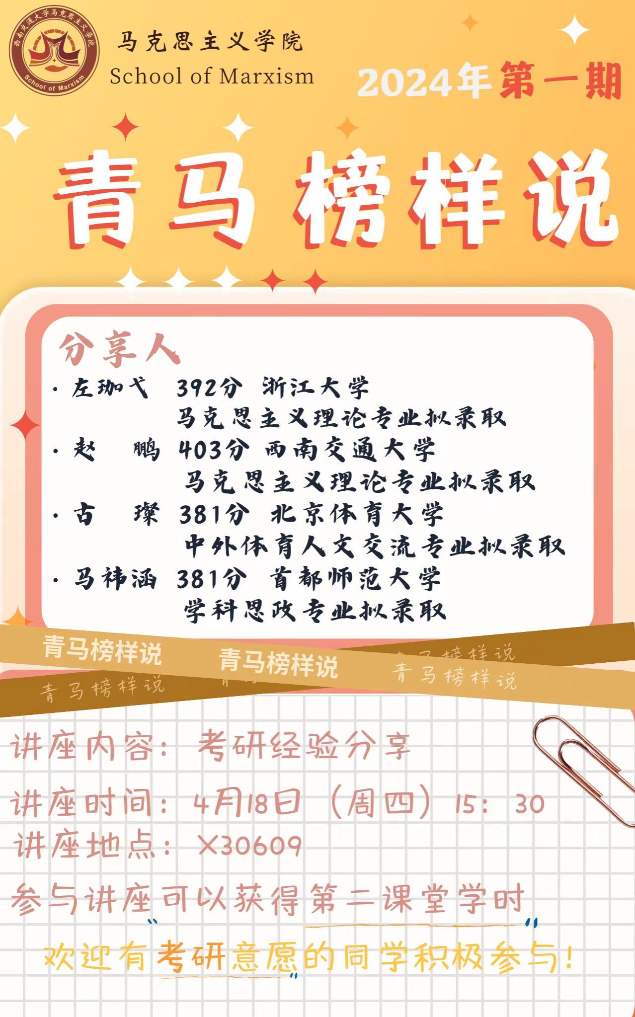 为了发挥朋辈教育作用,为意向考研的同学搭建交流学习的平台,让同学们明确考研的方向与目标,了解考研择校、备考等方面的注意事项,365英国上市网站官网将于4月18日15:30组织“青马榜样说”考研经验分享会。现将有关事宜通知如下:
