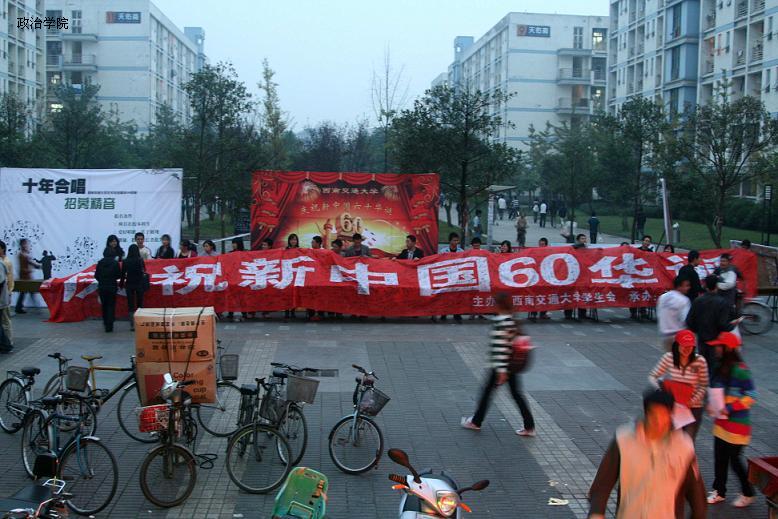 60年,弹指一挥间。2009年,我们伟大的祖国迎来了她60岁的生日。为了让同学们可以表达自己对祖国的一份赤子之心,政治学院学生会在三食堂展出了一幅巨型的为祖国母亲祝福的精美展板,并铺有一张写有“留下我的印记,庆祝祖国六十华诞”的巨型横幅,让同学们在横幅上写下自己的名字和自己对祖国母亲六十华诞的祝福。政治学院学生会主席魏河凡同学带领着学生会的同学们于下午4点开始做准备工作,精心布置了活动现场。