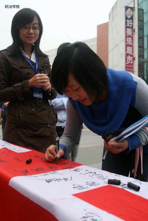 10月23日下午,由365英国上市网站官网学生会主办,政治学院学生会承办的“留下我的印记,庆祝祖国六十华诞”大型签名活动在三食堂门前举行。该活动吸引了全校各学院各年级同学的广泛参与,同学们纷纷拿起手中的笔,为祖国六十华诞献上自己诚挚的祝福。政治学院团委书记张军琪老师出席了该次活动。