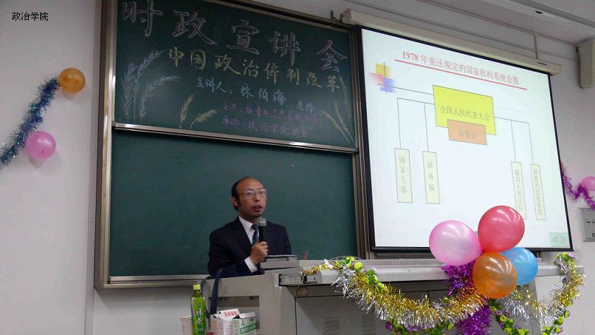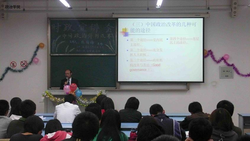 11月5月晚,由校青联主办,政治学院团委承办的“政治宣讲会—中国近三十年政治体制改革与前瞻”在犀浦校区2422教室举行,此次宣讲会举办方有幸邀请到了政治学院常务副院长林伯海教授作为主讲人,经过前期的大力宣传,此次宣讲会吸引了政治学院以及其他院系的大量同学的广泛参加。晚上7:30,宣讲会在全场热烈的掌声中正式开始。