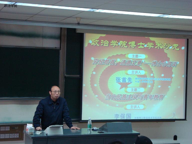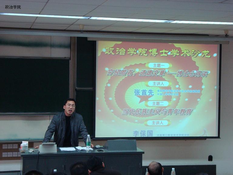 2010年4月10日下午2:30,九里逸夫馆4508教室内,政治学院首届博士沙龙在这里正式亮相。本届沙龙由政治学院首届博士研究生张首先和政治学院08级博士研究生李保国做主题发言。政治学院常务副院长林伯海教授作为特邀嘉宾参加了活动,来自我院的博士生、硕士生、本科生等共计50余人参加了本次沙龙,活动由朱志浩博士主持