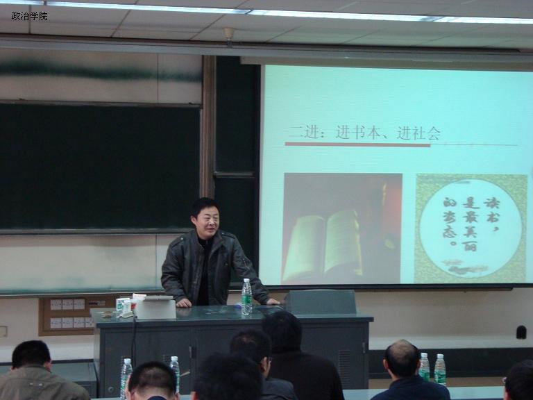 首先由张首先博士做了“穷经皓首,道德文章----博士心得谈” 的主题发言。他论述生动形象,结合自身的学习经历向同学们传授了博士心得。他告诫同学们要有“进书本、进社会”的积极心态;在做学问方面要有“定向、定位、定力”的坚定决心;最后他告诉了同学们他读博的四个体会:小问题、宽视野、多学科、勤思考。