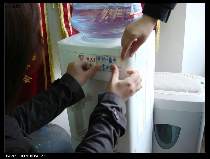 4月9日,学生工作组的办公室发生了一个小小的变化——所有的饮水机都被贴上了可爱的标语贴“节约一度电,享用健康水”。