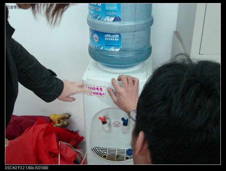 据悉,这些可爱的标语贴是07政治1班团支部的杰作。意为:饮水机关机两小时即可节约1度电,而饮水机持续开机多次煮开的水变成千滚水含有大量有害元素,影响身体健康。在西南大旱,水、电资源稀缺的背景下,他们通过自身的努力,渴望为保护环境做出贡献。通过对学生工作组办公室做用电习惯调研之后,课题小组的同学们针对正确使用饮水机撰写了“关机两小时,节约一度电;拒绝千滚水,享用健康水”的倡议书。