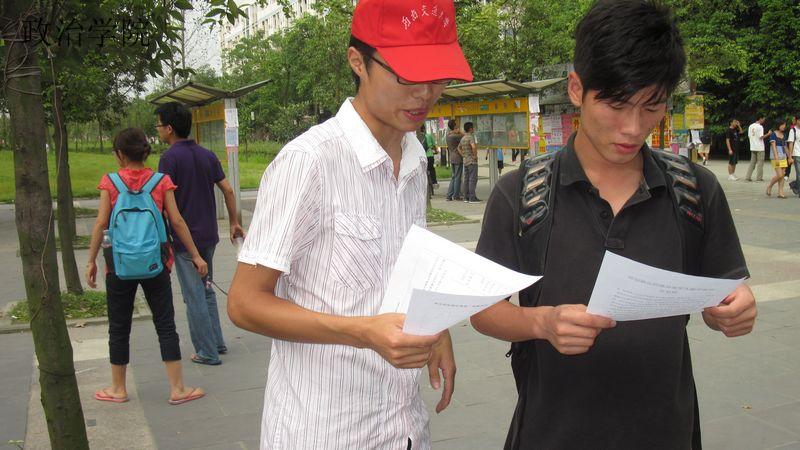 今天下午,政治学院的十几名志愿者在二食堂门口开展了此项志愿服务行动的宣传与报名活动。他们组织有序,分工明确。一部分志愿者向来往的同学发放传单,讲解此次志愿行动的内容和意义,而另一部分人就在报名点向前来报名的同学提供咨询服务及组织报名。“同学,9.11日、12日的美化校园志愿服务你愿意加入吗?”我们的志愿者们头戴小红帽,一遍又一遍的向来往的同学宣传。一旦有人拥有参加的意向,就会更仔细的向他讲解此次活动的意义和内容。他们用自己的激情感染着身边的同学,用自己的行动传递着志愿者精神。