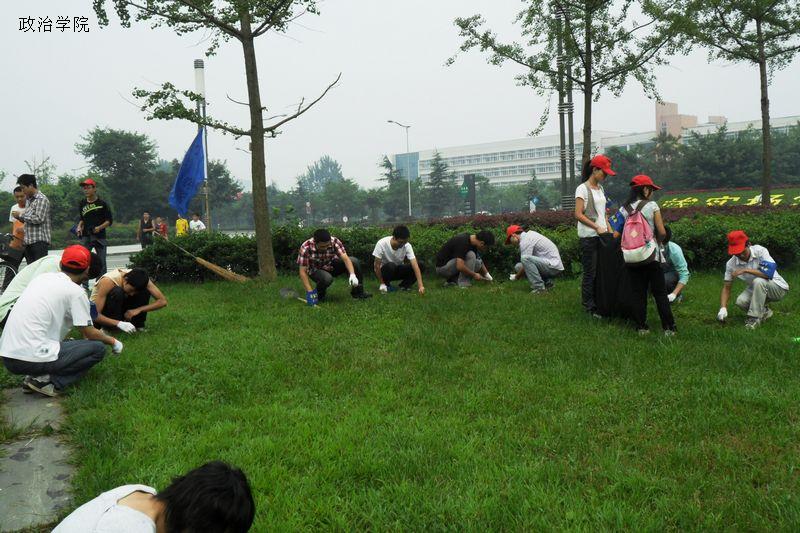 早上8点,政治学院的志愿者们就满怀热情地来到了图书馆门前集合,准备开始美化校园活动。随后,在工作人员的组织下,各学院代表依次领取垃圾袋、手套、除草工具等。接着,后勤集团的师傅对各学院学生代表进行集体培训,教授大家如何识别杂草和使用工具。9点,校团委书记朱剑松老师宣布本次活动正式开始,并号召同学们积极、认真参与。随即,各学院志愿者们就来到各自负责的区域,积极地投入到劳动中。老师和同学们在草坪中忙碌的身影构成了交大一道独特的风景线。