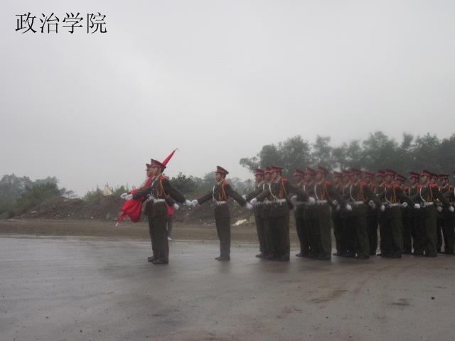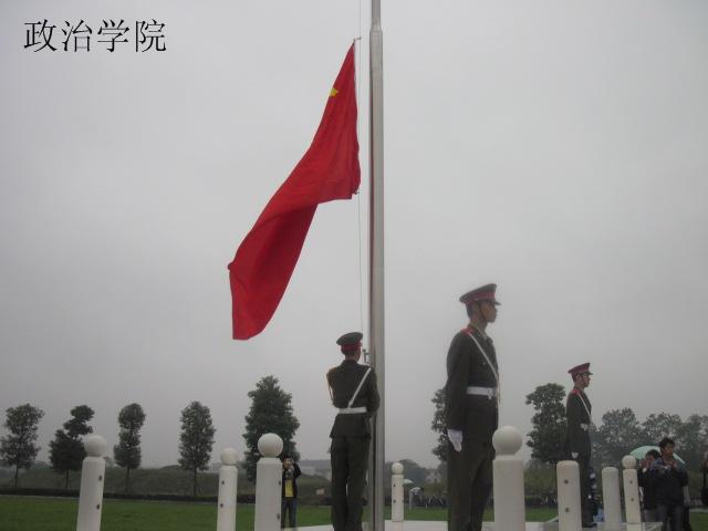 在距升旗仪式正式开始还有半个小时的时候,校国旗班的同学已集合完毕,整装待发,国旗班是学校从全体国防生中经过严格选拔后组建而成的一个班级,肩负着学校升降国旗的神圣职责。虽然是国庆长假期间,但是还是有很多的同学自发的来到广场上参加此次升旗仪式。秋天的成都飘着细雨,但雨水却浇不灭同学们心中的那份激情。越来越多的同学来到了广场上,有的没有带雨伞,在雨中他们的头发湿了,衣服湿了,但他们仍然精神饱满。早上8:00升旗仪式如期的在图书馆前的广场上举行,国旗班的同学身着绿色的军装,迈着矫健的步伐护送国旗从广场中央走过,在现场老师和同学们的注视中顺利完成了国旗的交接。“起来,不愿做奴隶的人们······”在大家嘹亮的国歌声中,五星红旗在风雨中冉冉升起。