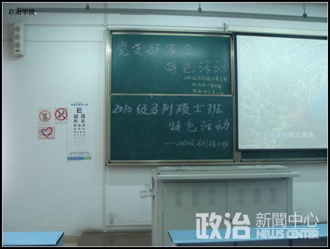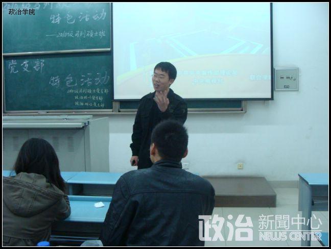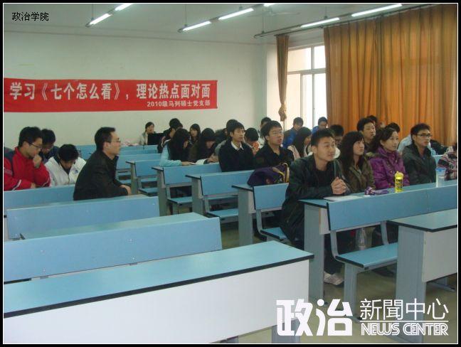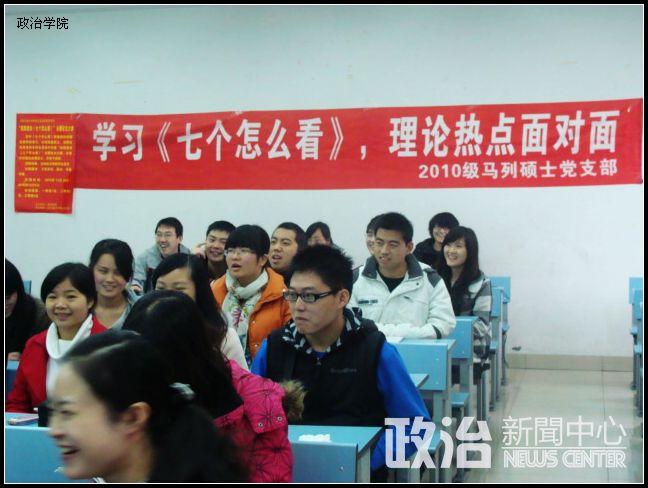 11月27日下午,政治学院2010级马列硕士班党支部特色活动“学习《七个怎么看》,理论热点面对面”在X2523教室举行,本科08政治1班和2班党支部全体成员参加了活动,大家就相关问题进行了热烈的讨论。