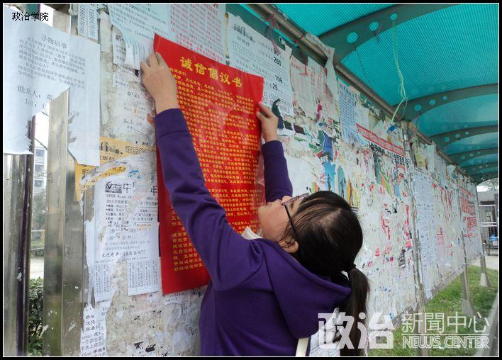 12月5日下午四点,政治学院分团委的干事们在北区宿舍楼前的公告栏上张贴诚信倡议书。在活动的尾声,本次活动负责人告诉随队的记者,现在许多大学生觉得诚信的传统美德离他们有点遥远,其实只要诚信考试,无论考出什么样的成绩,都无愧于自己的良心才是最重要的。