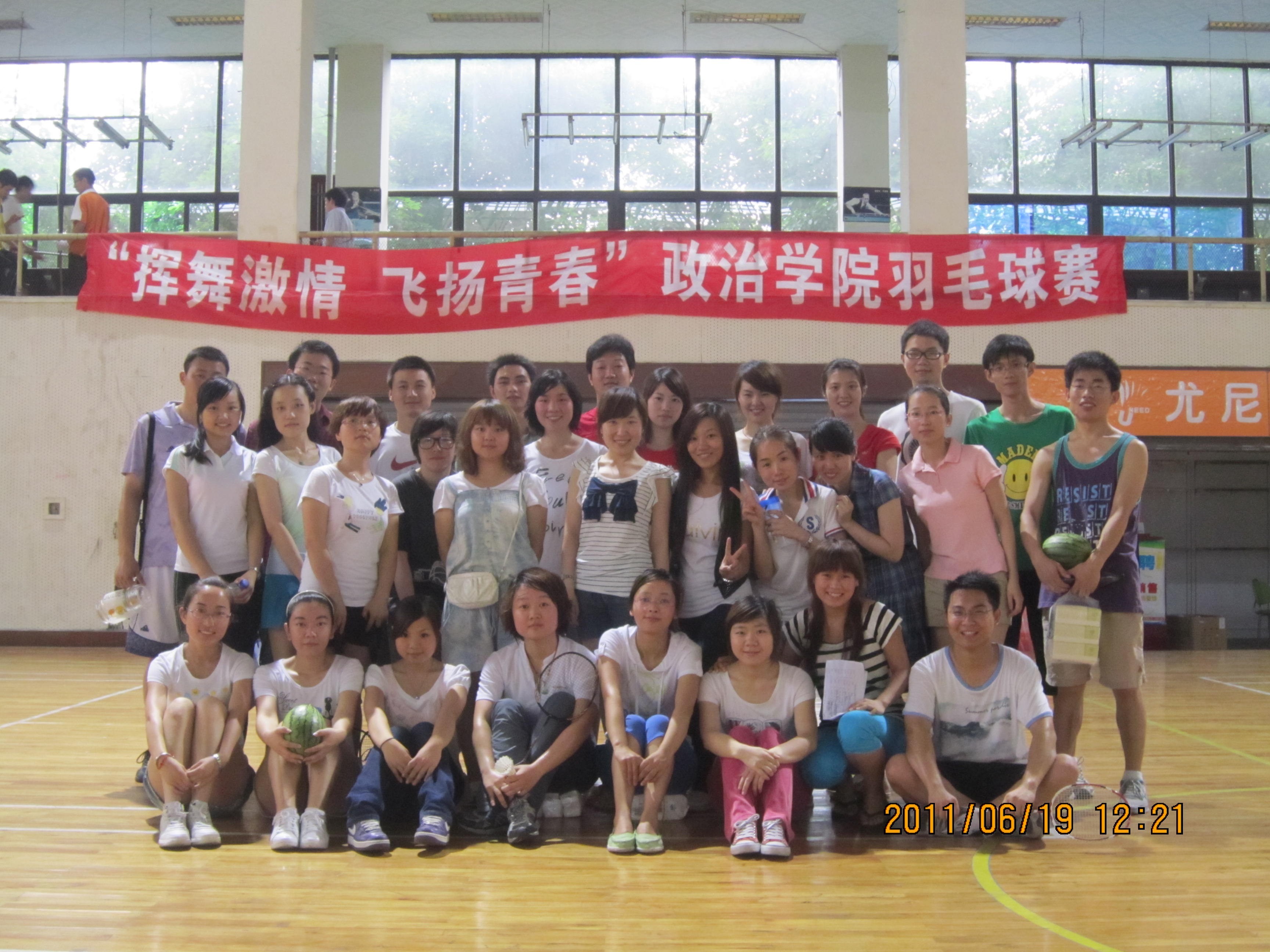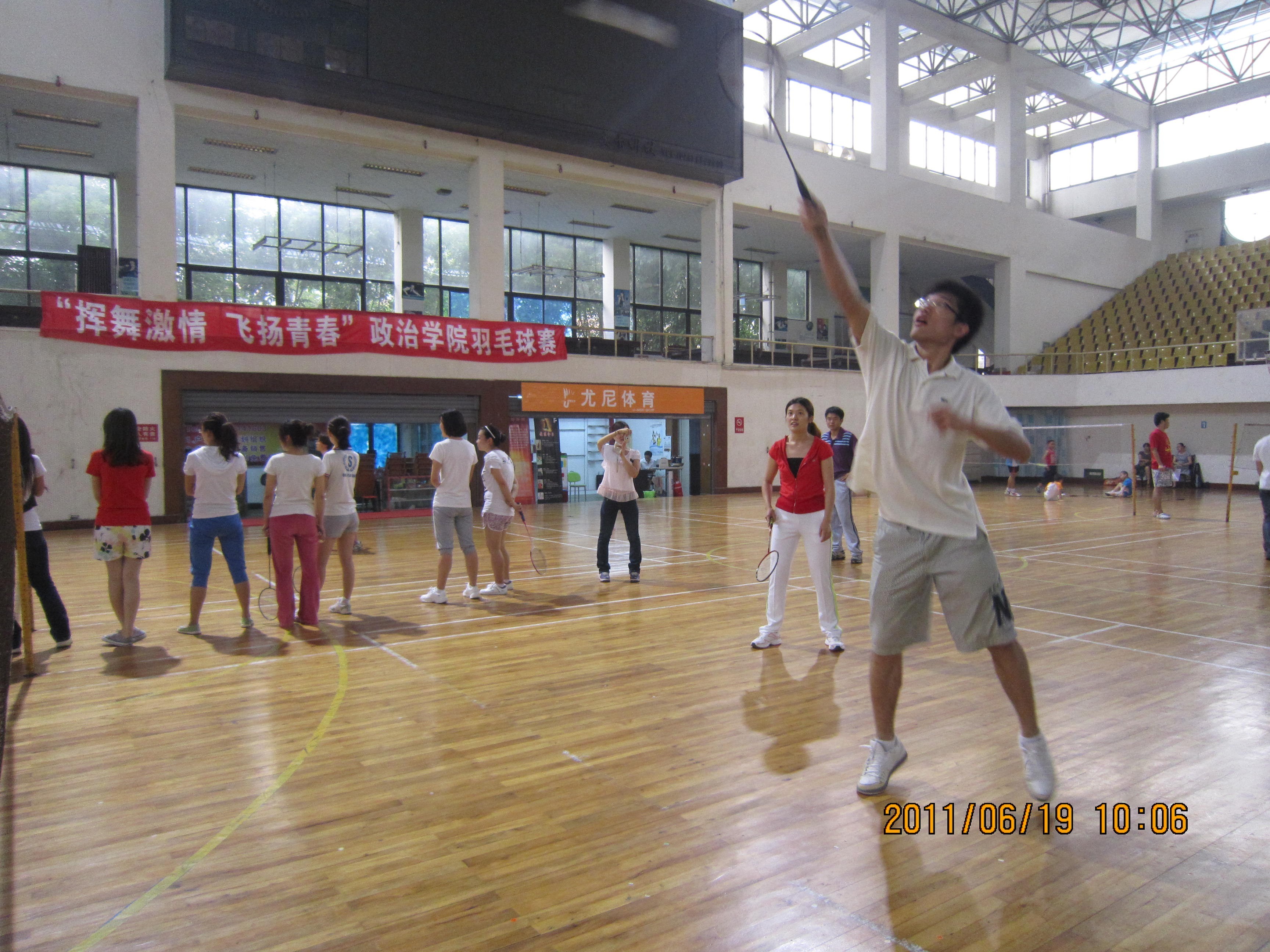 为了丰富同学们的业余生活,增强同学们积极参加体育活动、锻炼身体的意识,培养同学们顽强奋斗、勇于拼搏、团结协作的优良品质,增进大家的友谊,政治学院研究生学生会分会于2011年6月19日上午9:30——12:30在詹天佑体育馆举行了主题为“挥舞激情,飞扬青春”的羽毛球比赛。参赛人员包括10级法学系的两个班以及10级马列硕士班的同学。比赛分为男单、女单以及混双三种形式,均为淘汰胜制,以21分为一局,由研会组织人员抽签决定比赛次序,裁判人员则由三个班的同学自愿报名担当。