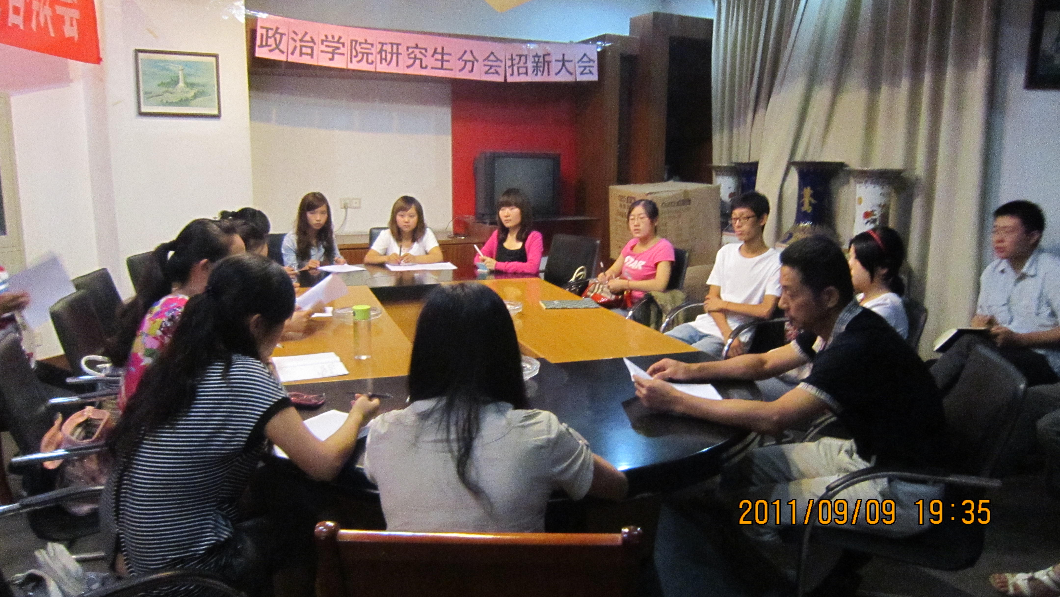 2011年9月9日晚,365英国上市网站官网政治学院研究生会2011年度招新大会在0801会议室如期召开。我院蒋小忠副书记和辅导员高阳老师亲自莅临指导,会议由研究生会主席刁成林同学主持,研究生会副主席、各部门部长、副部长以及部分11级研究生们参加本次会议。