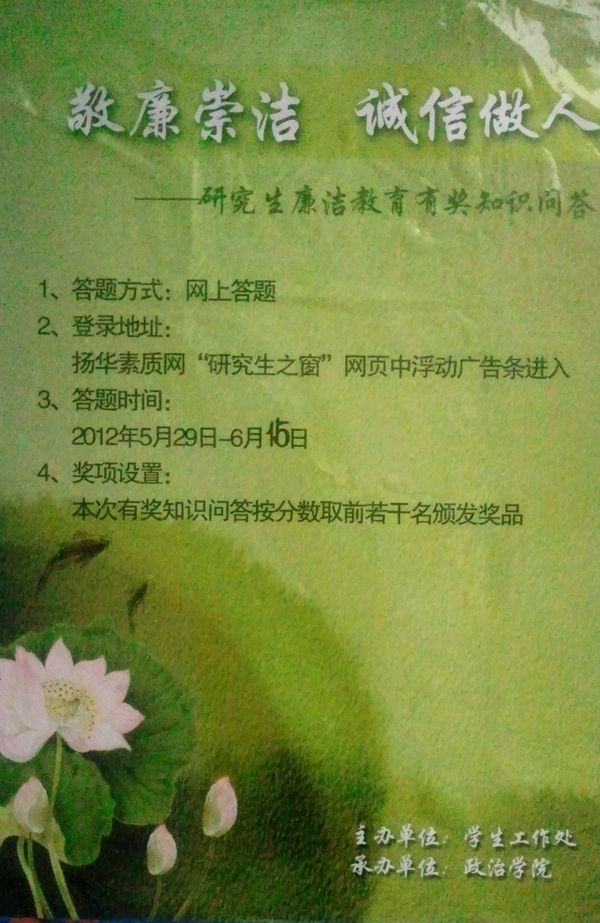 2012年度研究生廉洁教育系列活动活动共分为两大部分:第一部分,于年5月30日至6月15日开展研究生廉洁教育有奖知识问答,按分数取前若干名颁发奖品。此次有奖知识问答是从扬华素质网“研究生之窗”网页中浮动广告条进入并通过网上答题的方式进行,网络题库涵盖了党的反腐政策、学术道德知识、考风考纪诚信教育、廉洁法制知识与案例、社会公德和职业道德、形势政策廉洁知识、中外廉洁名言警句、伟人与廉政等内容。活动主办方希望通过这种答题的方式来强化研究生们的廉洁诚信教育,使他们在学术上求真实讲诚信,在做人上求廉洁防迂腐,并且牢记学术道德,诚实做人,诚信做研究。