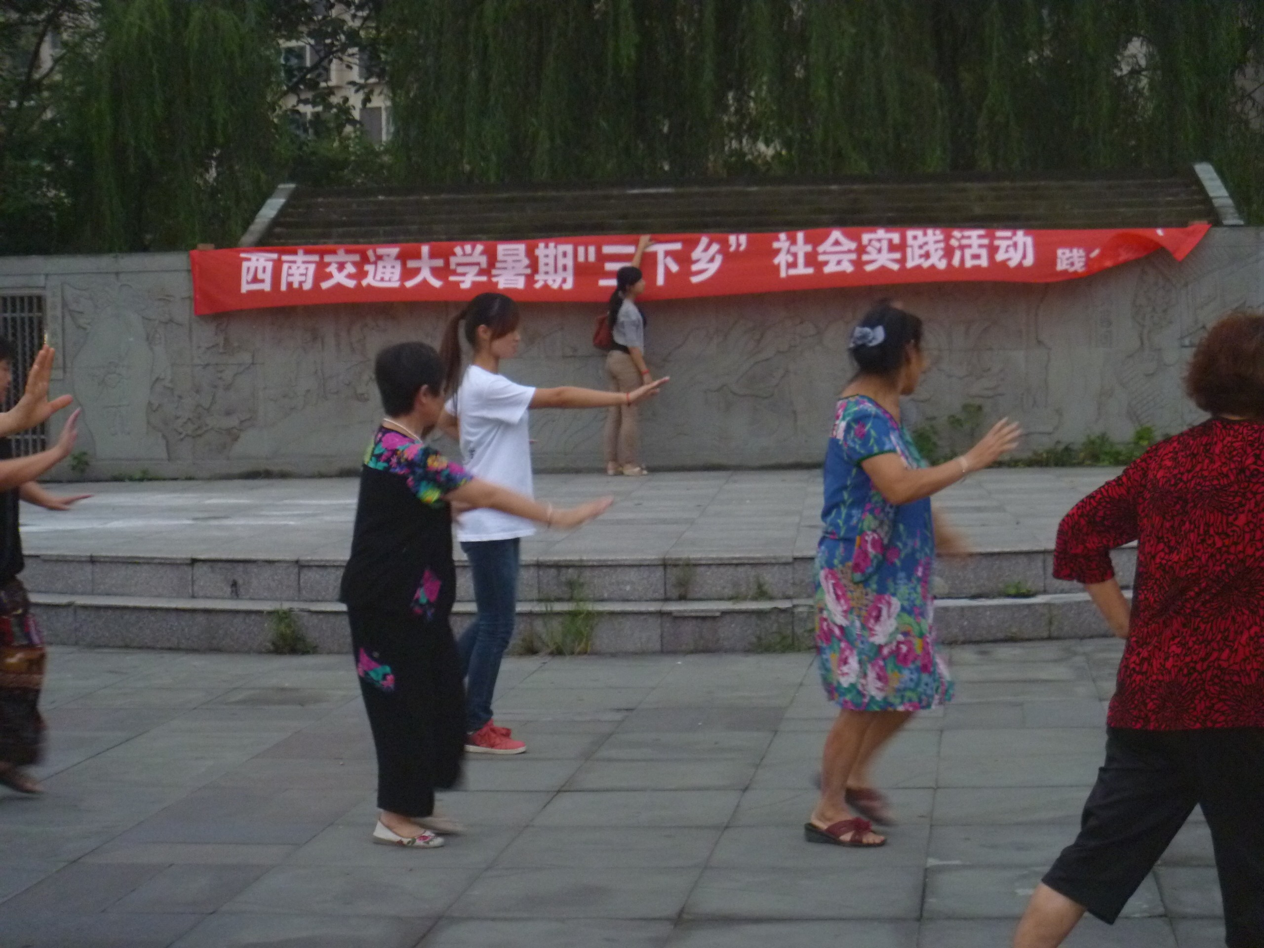 8月20号到21号七点至八点,我们一队人分开行动,在广场上宣传广场舞文化,倡导大家一起来跳舞,并通过交流了解了社区中老年妇女对广场舞的态度和她们的实际情况和需求。我们了解到,很多居民非常愿意加入到广场舞的队伍之中,“不会跳”是她们没有加入广场舞队伍的主要原因之一。她们希望,我们在教广场舞的过程中,先教大家分解动作,选择的动作能锻炼身体的同时简单点儿。应居民的要求,我们8月22号—25号,每晚七点半到八点,在广场上教大家广场舞的分解动作,一步一步的教,一拍一拍的示范,八点之后,社区会放音乐让大家跟随音乐一起跳。