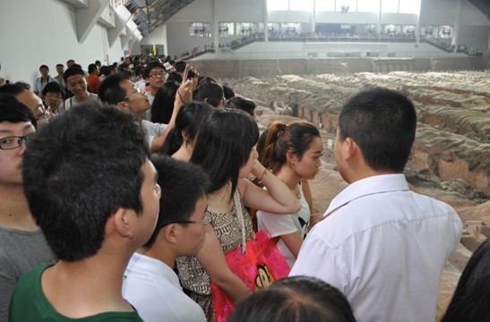 在西安市临潼区的秦始皇陵兵马俑博物馆,接触到了世界的第八大奇迹。讲解员是个非常幽默的陕西人,从开场白到解说词都能“击中”我们的兴趣点。导游演示的秦朝兵车伞架,让我们连连惊叹其“高端”的技术,巧夺天工的设计让人难以想象在同时代还有什么比这更加先进的器械。陈列着兵马俑的二号坑整齐的排列着出土并被修复的秦俑和战马,环形阶梯上的游客非常密集,金发碧眼的外国人更是“泛滥”,几乎所有人都端着“长枪短炮”,试图找到一个好的位置留下兵马俑的影子。在展厅里能够看出许多的兵马俑并未被挖掘,这是国人的一种谨慎更是对本民族文化的负责。面对历史的遗产、民族的瑰宝,作为晚辈的我们又有什么理由不为之惊奇和叹服呢?