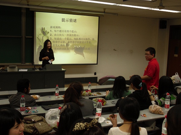 然后,这次活动的主体部分开始,以部门为单位进行竞赛,最后根据每轮得分的总分进行相应的奖励,由主席与副主席进行监督和计分。活动的流程为抽签记名字、提示猜谜、心有灵犀一点通和终极密码四个小游戏,在游戏竞赛的过程中,充满了令人忍俊不禁的环节,比如 “你比我猜”环节中用肢体语言表现出最近十分热门的中国好声音这个节目,大家纷纷模仿最经典的动作——按灯!转身!气氛也在这里达到了最高潮。之后还有其他等等赢得满堂掌声和笑声的小环节。不知不觉,两个小时过去,最后比赛结果是实践部获一等奖,办公室部、学术部获二等奖,新闻中心和外联部获三等奖。不过各个部门还是非常和谐,本着友谊第一的原则互相鼓励和分享奖品。