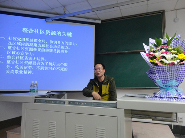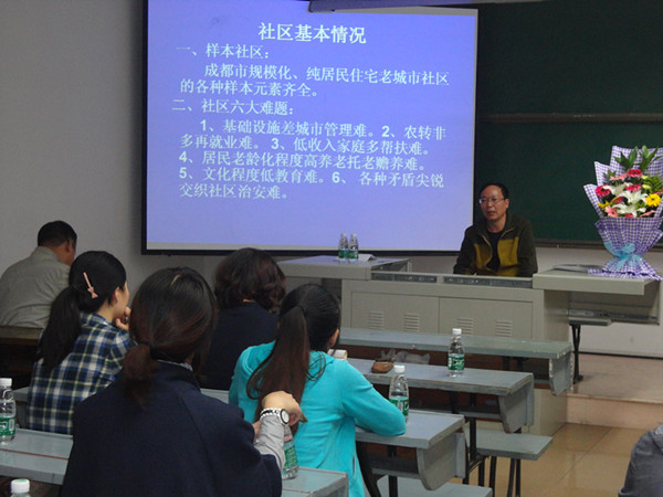 活动伊始,徐教授向大家简要的介绍了周成刚书记。值得一提的是,2001年12月,以周成刚任党支部书记的西南街社区新班子上任。2004年该社区自创一套“案例工作法”来解决社区里的矛盾纠纷,并受到区、市、省综治委的一致肯定。目前,金牛区已将案例工作法在全区推广实施。