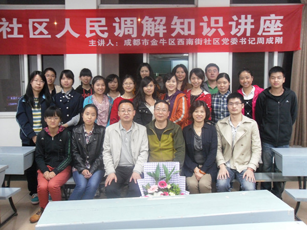 (记者 王娜 报道 杨迅 摄影)2012年10月24日7点半,政治学院法学系邀请到了成都市金牛区抚琴街道西南街社区的党委书记、居委主任周成刚和党委副书记郭美到我校进行知识交流,周成刚书记进行了“社区人民调解知识” 讲座。此次讲座由我院法学系徐兴祥副教授主持,徐教授是中国政法大学知识产权中心研究员,成都市仲裁委员会仲裁员,并具有丰富的涉外法律知识。本次活动由2012级法学硕士班承办。