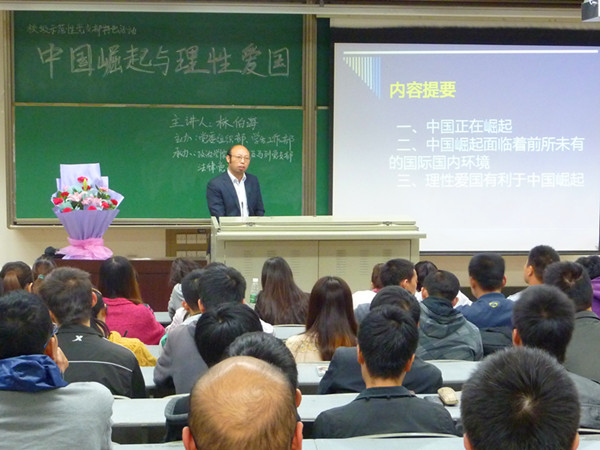 在第三个版块,林院长谈到,作为一名当代青年大学生,理性爱国十分有利于中国崛起。在历史上,多数大国的崛起几乎都要经过战争的洗礼,但随着时代的变化和历史的变迁,中国的崛起并不一定需要经历战争的锤炼,但一定需要运用的是智慧与理性,这一历史议题就对当代青年大学生提出了新的爱国要求,即在中国长足发展的战略机遇期,需要理性爱国的热血青年,同学们应当理性、理智、理解、理论,要紧跟潮流练好本领,做身体好,学习好,工作好,知识化,技术化,国际化的青年。