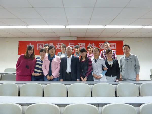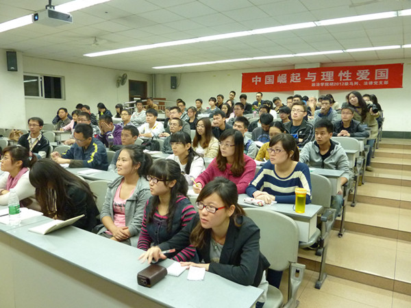 (通讯员 郭霦 报道 记者 张若云 摄影)10月30晚上7点半,由我校党委组织部、学生工作处主办,政治学院硕士2012级马列党支部、法律党支部承办的校级示范性党支部特色活动、政治学院党委喜迎十八大系列活动——“中国崛起与理性爱国”专题讲座在九里校区逸夫馆4218教室成功举行。本次活动积极响应了校党委组织部和学生工作处关于“加强支部建设、实现晋位升级、迎接中国共产党第十八次全国代表大会的胜利召开”的响亮号召,也向广大师生诠释了中国正在崛起,国际地位日益提高的同时,当代青年学生要理性爱国的,引发了广大师生对于“中国的崛起与是否要理性爱国”的积极思考和热烈讨论。