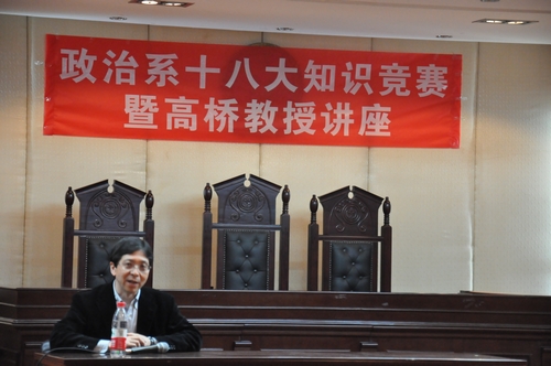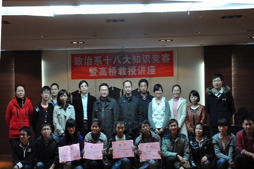 为认真学习、领会胡锦涛总书记十八大报告精神,促进国际交流,2012年11月16日晚19:30,由政治学院政治系教工党支部与政治本科生党支部联合举办的十八大知识竞赛暨高桥教授座谈会于X5403举行。政治学院党委副书记蒋小忠老师,日本庆应义塾大学高桥伸夫教授以及政治系全体师生参加了本次活动。活动由方纲老师主持。