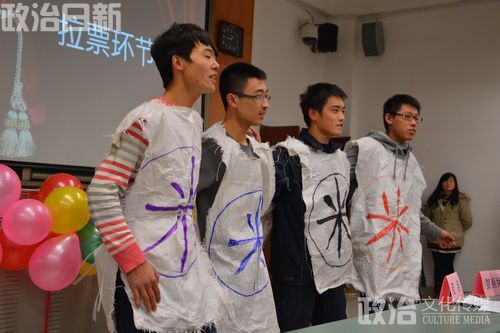 最后的拉票环节里,政治文化传媒以歌曲串烧“换大米”的才艺展示方式进行了最后的竞争,争取评委们的评分。