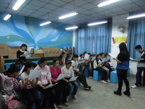 经过前一次支教的磨合,在这次支教过程中明显顺利了很多。下午四点钟,上课铃声准时响起,支教队员带着自己小组的学生进入教室,开始了各自的教学课程。听,阵阵歌声从音乐教室传出,原来歌唱组成员们正在编排《最初的梦想》,他们先是试唱几遍,然后再将小朋友分组,以新奇的合唱方式来完成这首歌曲。小学生们学得不亦乐乎,仔细地听队员们讲的要点,然后跟着音乐试着找节奏。看着他们一张张认真的小脸,队员们也很有动力。在歌唱组的教学进行得如火如荼的同时,其他支教小组也正有条不紊地进行着。其中,舞蹈组为同学们带来了《不要不要》和《快乐崇拜》两个舞蹈,他们根据这两个舞蹈的性质让男女生分开来学,由两位队员教女生《不要不要》,另两位队员则教男生《快乐崇拜》,在几个尽职的老师的耐心教导下,同学们学得很快,舞蹈已经初步成型,相信在六一儿童节时,他们会成为耀眼的明星。看,美工组的队员们正手把手地教学生折纸蝴蝶,他们用最简单易懂的语言来描述折纸的步骤,并时不时地停下观察小学生们的进度及折纸的情况,为的是让每个人都能折出他们满意的作品,小学生学得很卖力,不一会一张张纸片就在他们手中变成一只只蝴蝶,让他们很有成就感。话剧组也丝毫不逊色,他们确定了剧本,接着便是分角色扮演,但这之前,人员的选定却不是那么容易,队员们要根据剧中人物特点及小朋友们各自的外貌性格特点而定,因而花费了挺长时间,但一旦角色选定,剩下就是排练了。在排练过程中会有相互的对演,所以整个教室充满了笑声,教学也在和谐融洽的气氛中进行,取得的效果很好。