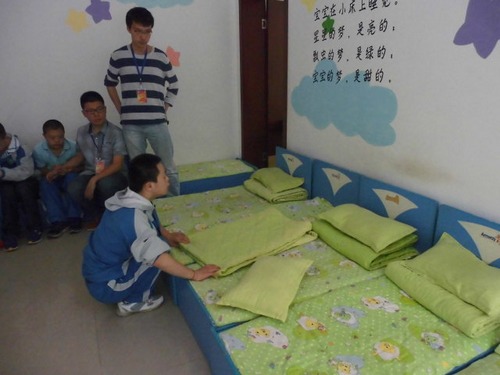在接下来的时间里,由于孩子们还要去参加“叠被子”比赛,队员们便在老师的安排下带领他们一起练习叠被子。经过多次训练,在孩子们基本掌握折被子的技巧后,老师还让两个孩子进行了一场小小的比赛,由一个孩子负责计时,而我们的一个队员当起了裁判。在比赛过程中,他们的动作并不熟练,被子折的也没老师要求的那样整齐、规范。好几次支教队员们都想上去帮帮他们,但都被老师拦住了。后来老师才说,要让他们通过观察对比,发现对方做的不到位的地方,这样他们才会知道哪里做的不好,然后才能去不断的改进。果然,后来这两个孩子叠的被子都有了很大的进步。原来,在我们看来一些很简单的事情,他们做起来也会很难。他们只有通过不断的练习,才能不断进步。我们有时因为害怕别人发现耻笑自己,就总想去掩饰自己所犯的错误,其实只有那些错误真正暴露出来,你才会去重视,也才会真正避免再次犯同样的错误。