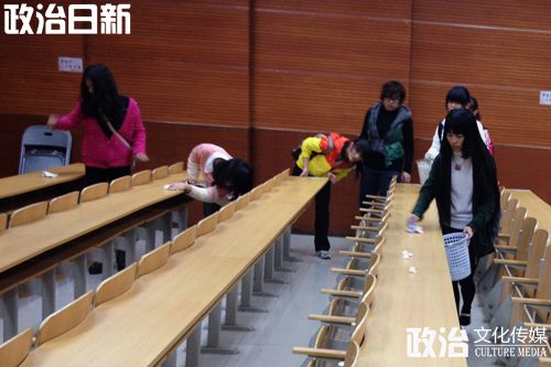 活动刚开始时,很多同学不知道该怎么办,于是班长陈欣同学和团支书孙国强同学提出采取共同行动的方法减少失误。首先是贴标语,每个同学要拿着印着求职技巧的标语依次贴在每个桌面的两侧,拿着印着“爱护卫生,保持安静”的标语对称贴于教室两边的墙壁上;然后是清理桌内,合理回收可回收垃圾和清理其他垃圾桶内的垃圾;最后是更换该教室的电脑桌面背景,即换成我们事先准备的“天道酬勤”大背景。第一间教室在政治二班全班同学们的共同努力下,很快焕然一新。在有了一些经验之后,大家以五个人为一组整理另外的五间教室,其中两个人分别贴一侧的桌面求职技巧标语,一个人贴“爱护卫生,保持安静”的墙面标语,两个整理桌内的垃圾,规整的放置好垃圾桶。在大约20分钟过后,每个教室都已经整理完毕,活动也已经接近尾声。在完成整理任务后,所有同学都回到一起整理的第一间教室合影。