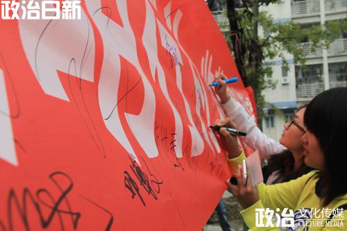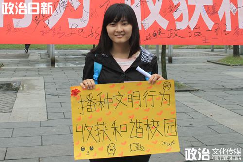 同学们兴致高涨地向路过的学生发放问卷,并介绍我们的志愿活动。写问卷的过程中,大家对传播文明行为的活动产生了兴趣,于是纷纷在横幅上签下自己的名字。为了宣传好此次活动,政治一班的同学们提前手绘了六份写有“播种文明行为,收获和谐校园” 这一主题的海报。在活动如火如荼进行中,许多人纷纷驻足,拿着我们的特制海报合影留念。整个过程中,政治一班的同学积极行动,配合默契,分工明确,王雷、杨婉莹和杜佳丽等同学负责拍照,其他同学热情地为同学们做活动介绍,气氛十分热烈。
