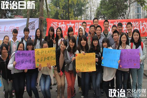 2013年10月28日中午,在班长丁麒元同学和团支书郭姝辰同学的带领下,2013级政治一班同学在二食堂门口开展了主题为“播种文明行为,收获和谐校园”的团日1+1志愿活动。第一次班级志愿活动,同学们积极性都很高,班长丁麒元同学一大早就带领几个男生到达了场地,文体委员司铎同学也早早为全班同学准备好了纸笔工具,经过一番准备工作后,中午11:30志愿活动正式开始。活动分为三项内容:填调查问卷、在横幅上签名、拍照留念。
