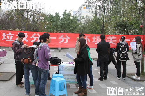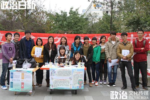 2013年11月3日上午10点至下午1点,政治学院2012级政治二班在南区三食堂门口开展本学期的志愿者“1+1”活动。本次活动由政治二班团支书王成龙同学策划并带头开展,旨在加大环保知识的宣传,提高同学们的环保意识。