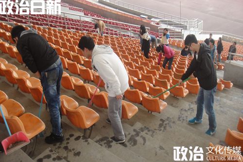 第二届西南交大阳光体育文化节将于11月16日开幕。为了使学院同学们有个更好的观赛环境,11月15日中午十二点,在政治学院学生会的组织下,政治学院各学生组织的部长带领干事们,来到犀浦校区北区体育场进行运动会看台的清扫工作。