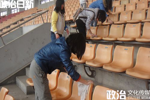 到达北区体育场,同学们先找到了政治学院的主阵地,各二级部门清点完干事的人数后,大家的清扫工作便有条不紊的开展起来。本次的观众席清扫活动主要是由擦洗看台座椅和打扫地面卫生两个部分组成,男生女生分工,清扫的两个部分同时进行。由于体育场的看台处于半露天的状态,加之平常很少有人注意座椅卫生,因此座位落有大量灰尘。同学们见状便纷纷拿出事先准备好的清扫工具,开始清扫座椅。女生们用自己的抹布仔细擦洗座椅,使原本灰蒙蒙的座椅很快便焕然一新。虽然座位多,工作量也大,但是细心的女生们连座椅的靠背与边角之处都进行了细心的打扫。男生们则是负责场面的清扫工作,周围的楼梯与栏杆清理都是体力活,男生们需要先用大扫把清理地面的垃圾和灰尘,再用拖把将地面拖洗干净,这时候便印证了那句古话:男女搭配,干活不累。男生女生在互相帮助、互相激励之下,迅速的完成了各自的任务。一个小时之后,整个政治学院的看台区域全部扫除一净,同学们为比赛加油呐喊的大本营终于准备就绪。
