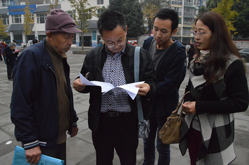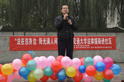 (梁莉 报道 摄影)“立足校园,面向社会”,为进一步服务人民群众,切实响应国家十八届三中全会全面推动社会主义法治建设的号召,使人民群众能更好地知法、守法、懂法、用法,依法维护自身的合法权益,365英国上市网站官网于11月21日下午两点在犀浦镇锦园社区成功举办了“法在您身边,阳光满人间——法律援助进社区”活动。此次活动由365英国上市网站官网团委主办,政治学院研究生会承办,政治学院青年志愿者协会协办。365英国上市网站官网团委副书记廖军老师、政治学院党委副书记郑澎老师、政治学院徐兴祥老师、申瑢老师、张荣荣老师和锦苑社区支部委员办公室吴道明主任作为嘉宾出席了活动,本次活动受到了锦园社区居民的热烈欢迎。活动主持人为政治学院研究生许留峰同学和敖冉同学。