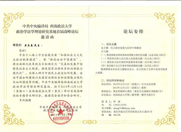中央编译局与西南政法大学共建的“政治学法学理论研究基地首届高峰论坛”14日在西南政法大学举行,此次的会议主题是:民主政治发展与法治中国建设。来自中央编译局、中国社会科学院、中国人权研究会、中央党校、深圳市政协、武汉大学、南京大学、复旦大学、吉林大学、华东师范大学、中南财经政法大学的40余位领导、专家、学者,以及西南政法大学的30余位教授参加了本次会议。其中全国政协原副主席、中国人权研究会会长罗豪才教授,中国社会科学院名誉学部委员、著名法学家李步云教授,中共中央编译局副局长俞可平教授,中共重庆市委统战部副部长李长明,中国社会科学院法学研究所所长李林教授,中共中央党校卓泽渊教授,深圳市政协副主席钟晓渝,致公党重庆市委专职副主委谭静等出席了开幕式。我院政治学专业2013级硕士研究生石立春以论文《现代化中主流意识形态话语权建设研究》应邀参会。