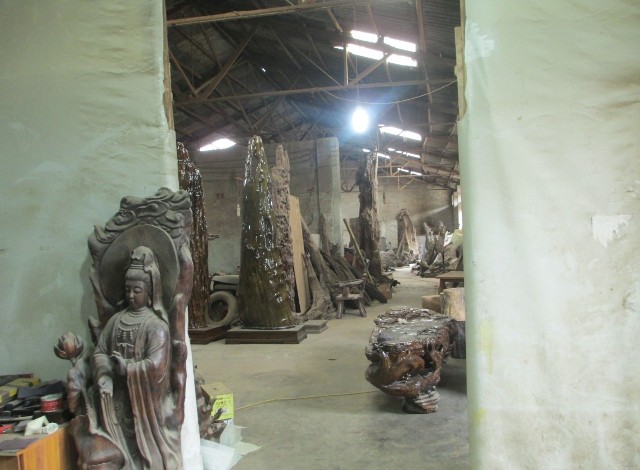 随后,项目组来到送仙桥古玩艺术品市场。此地的乌木专卖店近10家,与隐藏于居民小区的线下店相比,其同种商品价格上涨了8至10倍,且商品范围更为广泛,大型木雕、仿古家具一应俱全。通过对各店铺内商品价格的分析,项目组初步估算成都市内的乌木产业链保守市值过亿元。最后,项目组前往犀浦某处的乌木加工厂调研。在附近,多根长达数米的乌木堆放在菜地中无人认识。该乌木加工厂内,杂乱无章地摆放着一些工艺半成品与乌木原料,有工人正在切割乌木,或是对已具雏形的乌木工艺品作抛光、打蜡处理,空气中弥漫着一股乌木特有的清香。交谈得知,工厂管理人员对于乌木权属的观点与前面采访的店主如出一辙,却又对政府在乌木收购、运输过程中的“选择性执法”深感无奈。她坦言,有时为了能顺利地运输乌木,不得不向前来干预的有关人员支付“通行费”。