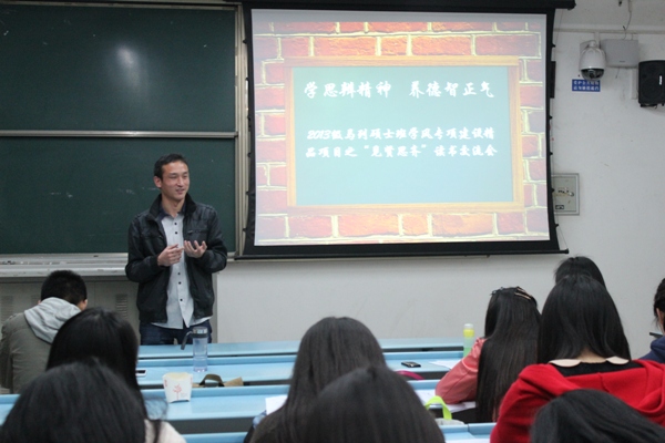 活动伊始,伴随着掌声,我们迎来了学霸徐田同学的演讲,从进校时迷茫到现在的术业专攻,并结合自己参加“‘毛泽东与中国梦’理论研讨会暨毛泽东思想研究会2013年年会”历程,徐田谈到了自己学习的一些心得体会。他说:“其实我们班的每一个人都很优秀,都有自己的一套学习方法,而我只是比较幸运罢了。能走到现在也没有什么别的可以谈的,不过是一直在坚持自己目标”。确实是这样,不仅是学习,甚至在未来的人生路上,只要我们坚持住自己的梦想并为之不断努力,我们一定可以走得更远。接下来,不同于徐田接地气式演讲,我院“学子之星”石立春同学以专业的学科言语和同学们一起分享了自己的学习心得。他说:“读书是一个厚积薄发的过程,而看什么书、如何看书则显得尤为重要。在读书过程中,我们一定要选择那些能培养自己文化素养、能够构建知识体系的书,要选择能够提升自身专业本领的书,要选择那些能为人生指路的书……其次,在阅读经典的时候,尽量不要只看译本,尽量做到原文与辅助资料并用,先看资料,了解文本大概,在结合当时的历史条件去分析、解读文本内涵……”。确实,读书很重要,但如何选择好的书籍也不容忽视。