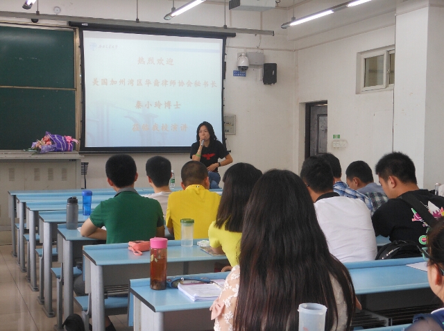 邓老师首先对秦小玲女士的到来表示欢迎,并向同学们解释了因秦女士回国逗留时间限制,故将原计划期末考试结束后暑期进行的《专题训练》予以提前。邓老师对秦女士进行了简要介绍:秦博士是美国加州湾区华裔律师协会秘书长,求学、工作经历非常丰富,研究生毕业于美国加利福尼亚大学伯克利分校(UCB)法学院,目前回国参与多项跨国NGO项目。曾在美国Texas A & M大学做访问学者,曾任金杜律师事务所外商投资项目律师、正信会计师事务所会计师,四川省发改委重大建设项目稽察办稽察特派员助理,获CPA及四川省司法会计鉴定人资格证书。在同学们热烈的掌声中,秦博士接受了学生代表献上的鲜花,开始了她的精彩讲座。