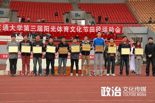 闭幕式上,各学院代表队方阵整齐划一地站在操场上,高举自己学院的旗帜。首先,主持人介绍了到场的嘉宾,接着宣布了获奖名单,场下的欢呼声此起彼伏。经历了两天的比赛,各个项目的奖项也都尘埃落定。政治学院运动员们在男子400米、100米、800米和1500米比赛中都取得了优异的成绩,更惹人注目的是我院今年的趣味项目比赛中也收获颇丰。通过全体运动健儿和学院工作人员的努力,政治学院获得了乙组第四名的成绩,并斩获体育道德风尚奖的荣誉。在表彰了在运动会期间表现优异的学院和运动员之后,颁奖典礼正式开始。桂富强、刘旭、廖军等领导为获奖的优秀单位及个人颁发了奖状,获奖学院代表个个喜形于色上台领取了奖状。