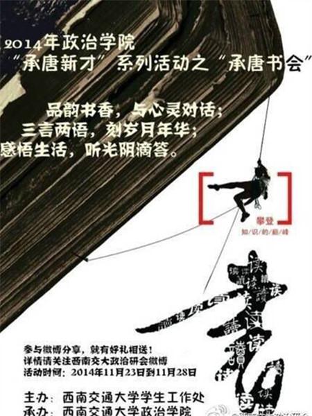 研究生之窗(孙茜 报道 摄影)11月23日晚上十点钟,“承唐新才”系列活动之“用三言两语,写下岁月印记”承唐书会活动在微博平台上拉开了序幕。此次活动由学生工作处主办、政治学院研究生会承办,以西南交大政治研会的微博为平台,发起线上读书交流会。参与者通过转发承唐书会微博同时@三位好友,并且分享自己的读书心得,就有机会获赠主办方提供的畅销书籍。