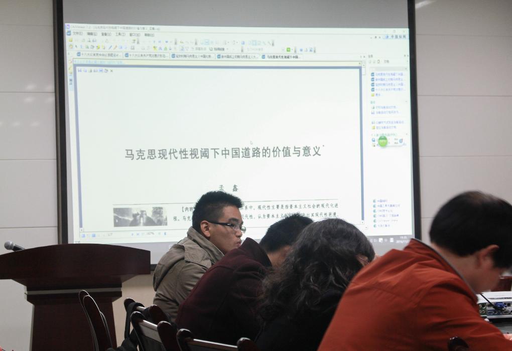 活动第二阶段,由2016级博士生曲成举讨论“马克思主义理论学科论文撰写的政治性与学术性”,16博士班班长周明星、16博士党支部书记闪月、16博士生(14硕士生党支部书记)邱铁鑫分别做8分钟主题发言。