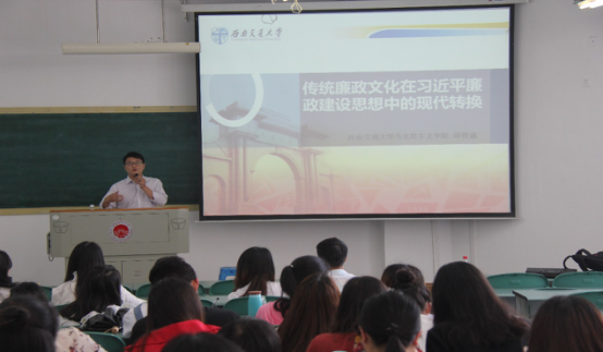邱铁鑫则以前段时间比较火的反腐剧“人民的名义”为引入点,从推动传统廉政文化实现现代转换的重要意义、传统廉政文化在习近平廉政建设思想中实现现代转换的主要内容、如何建设新时期的廉政文化等三个方面对“统廉政文化在习近平廉政建设思想中的现代转换”这一主题进行了分析,并在其中结合了当前社会的很多现实案例进行剖析,生动形象地为同学们进行了一堂反腐宣讲。