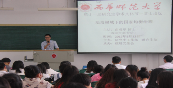 正值西华师范大学第十一届研究生学术文化节之际,我院博士宣讲团成员曲成举、邱铁鑫两位同学应西华师范大学研究生工作部邀请,于2017年5月12日前往南充,为该校研究生进行了两堂学术宣讲。曲成举的宣讲题目是“法治视域下的国家均衡治理”;邱铁鑫的宣讲题目是“传统廉政文化在习近平廉政建设思想中的现代转换”。