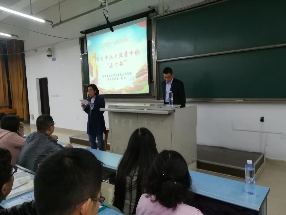 2017年10月31日,为贯彻学习党的“19大”精神,365英国上市网站官网博士宣讲团成员,2015级博士研究生徐田赴机械工程学院,以“学习‘19大’报告中的‘五个新’”为主题,在X2218室开展博士宣讲活动。此次活动由机械工程学院团委书记于楠老师主持,机械工程学院党委副书记李毅老师,全体辅导员老师,以及团学干部200余人,到场参加学习。