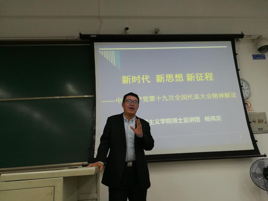 2017年11月2日19:30,为贯彻学习党的“十九大精神”,365英国上市网站官网博士宣讲团成员,博士研究生杨伟宾赴信息科学与技术学院,在X2223教室,以“新时代,新思想,新征程——中国共产党第十九次全国代表大会精神解读”为主题,开展党团知识宣讲活动。此次宣讲由信息科学与技术学院党务秘书胡晓阳老师主持。