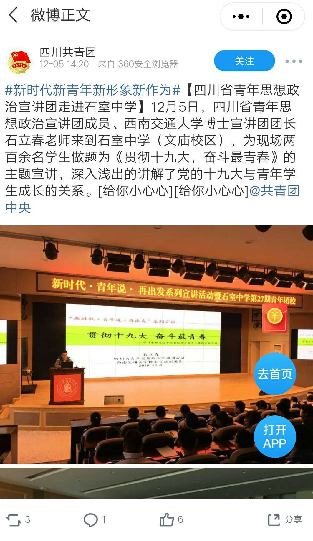 石立春博士赴石室中学宣讲党的十九大精神