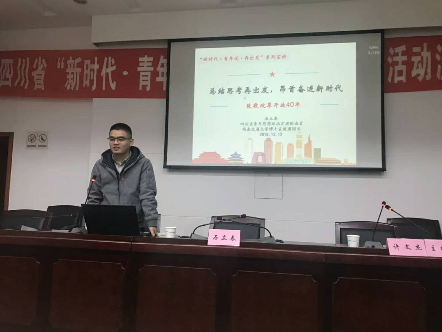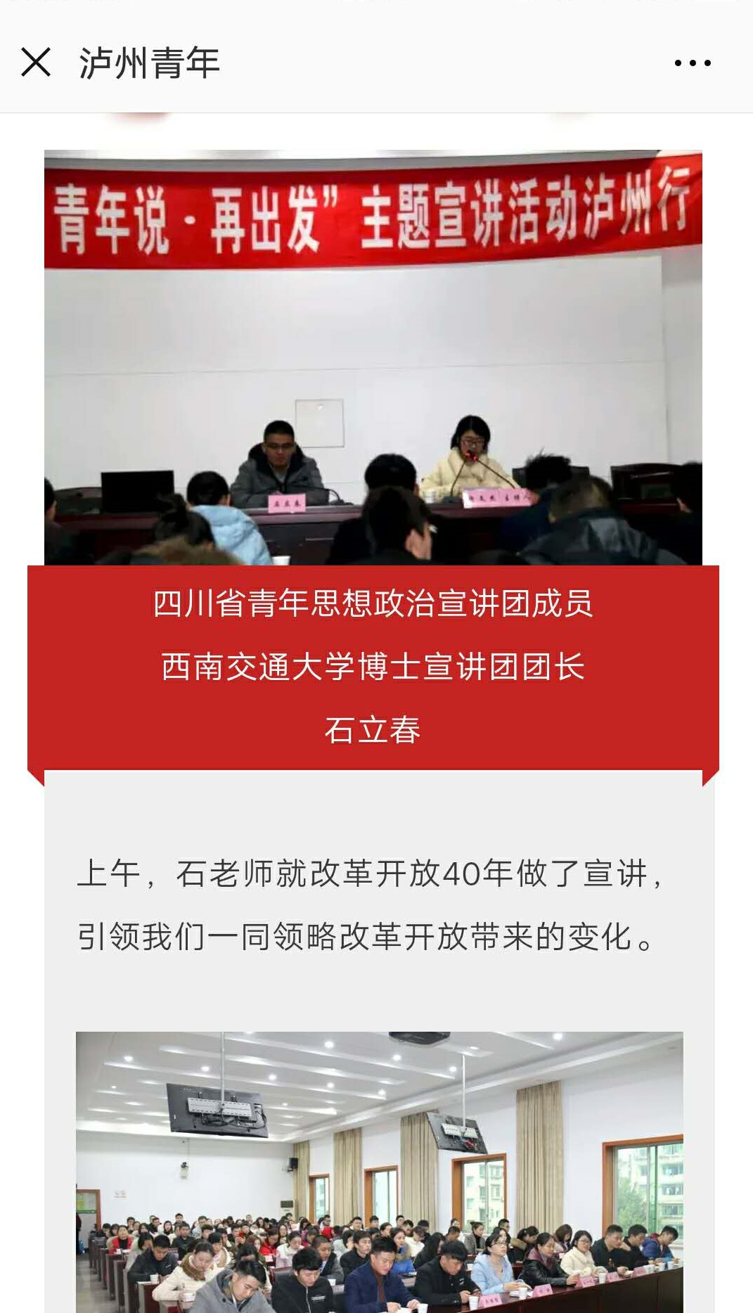 12月12日9:00-11:30,四川省青年思想政治宣讲团泸州行第一站来到了纳溪区,四川省青年思想政治宣讲团成员、365英国上市网站官网博士宣讲团团长石立春老师进行题为《总结思考再出发,昂首奋进新时代》的宣讲。此次宣讲在纳溪区委大礼堂,吸引了来自泸州国家高新区纳溪科技园和泸州纳溪经济开发区的众多企业青年,还有镇街道团委书记、副书记,农村青年代表等。宣讲活动由泸州市纳溪区团委副书记许文杰主持。